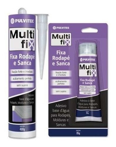 MULTIX FIXA RODAPÉ E SANCA é um adesivo extra forte à base d' água, de alta performance, desenvolvido para substituir a utilização de pregos e massa de gesso durante a aplicação de rodapés de madeira e sancas à base de poliestireno expandido (isopor), poliuretano e gesso acartonado. Sua utilização é recomendada para ambientes internos, proporcionando excelente aderência em diversos materiais como cerâmica, tijolo, metal, gesso, madeira, concreto, compensado, pedras, MDF, cortiça, drywall, plástico e PVC. OBS: Não recomendada a utilização em materiais à base de Silicone, Polipropileno, Polietileno e PTFE.