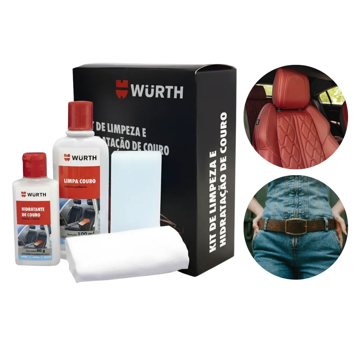 O KIT LIMPEZA E HIDRATAÇÃO DE COURO é composto por 1 Limpa Couro, 1 Hidratante de Couro, 1 flanela e 1 esponja de aplicação.