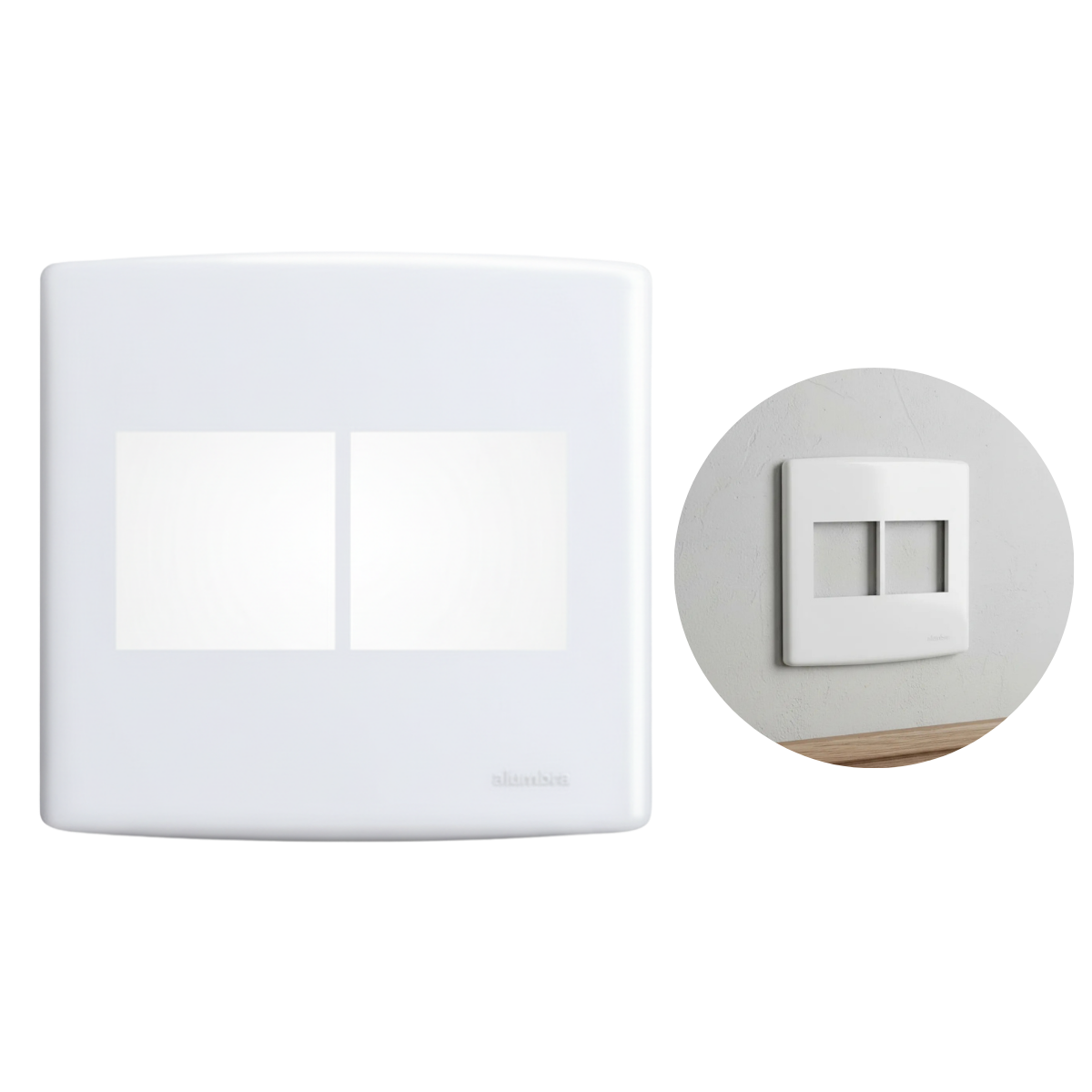 Placa 4x4 para 4 módulos horizontal com suporte. material plástico de engenharia com aditivo auto extinguível e proteção contra raios UV. Siena é a linha de interruptores e tomadas da Alumbra que é sucesso em todo o Brasil, isso porque reúne atributos como beleza, praticidade e economia.