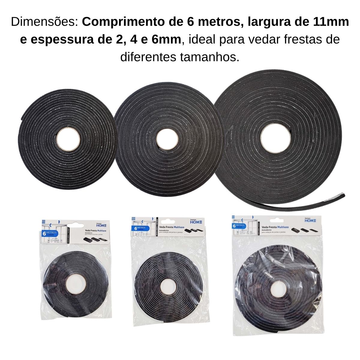 - Dimensões: Comprimento de 6 metros, largura de 11mm e espessura de 2, 4 e 6mm, ideal para vedar frestas de diferentes tamanhos.